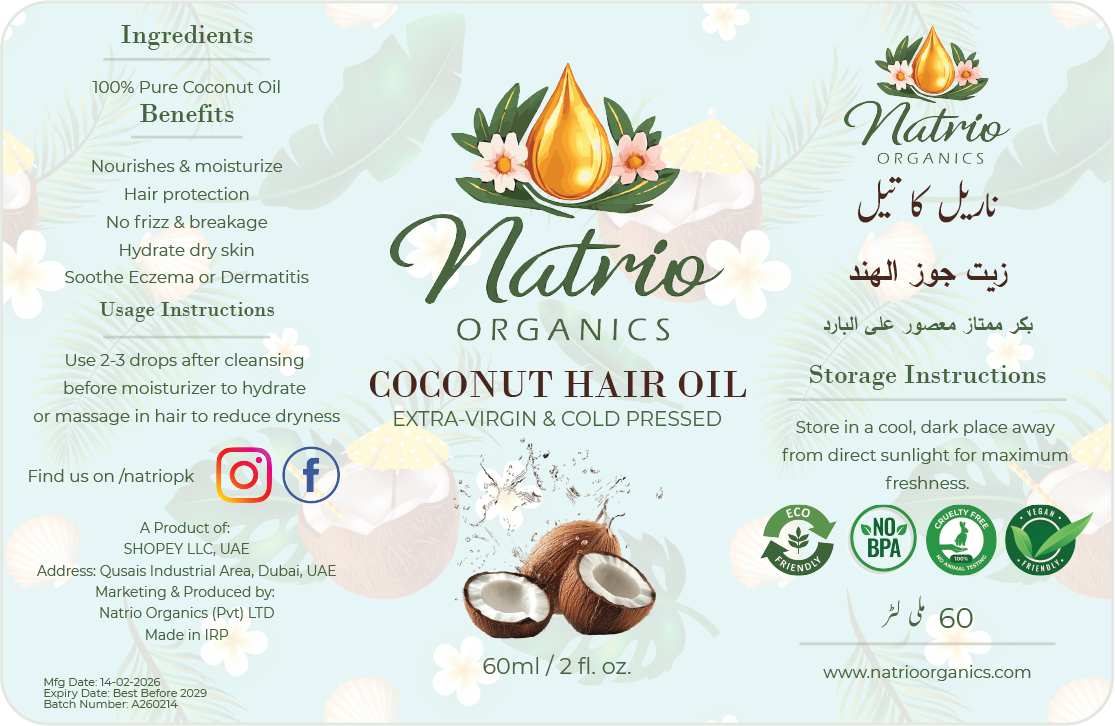 Natrio Organics Coconut Hair Oil (60 ml) is a deeply nourishing, natural solution designed to strengthen, protect, and revitalize your hair. Extracted from high-quality coconuts, this lightweight yet intensely moisturizing oil is rich in essential fatty acids and vitamins that help restore hair health from root to tip.